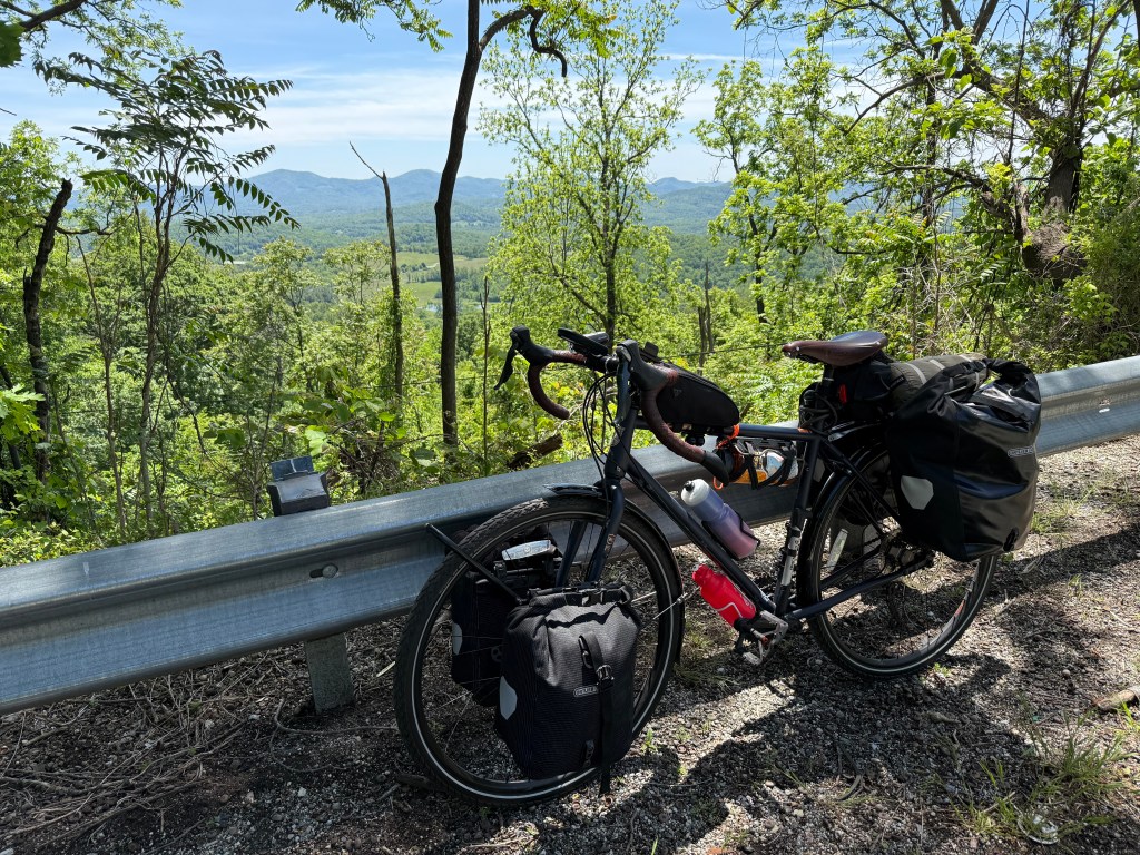 My Kona Sutra steel frame touring bike with front and panniers, three water bottle cages, a top tube bag, and lights. Fully loaded with 4 sets of clothes, jeboil, and some other stuff this bad boy weighs in at 95 lbs! Pictured below is on the way up to Blue Ridge Parkway.